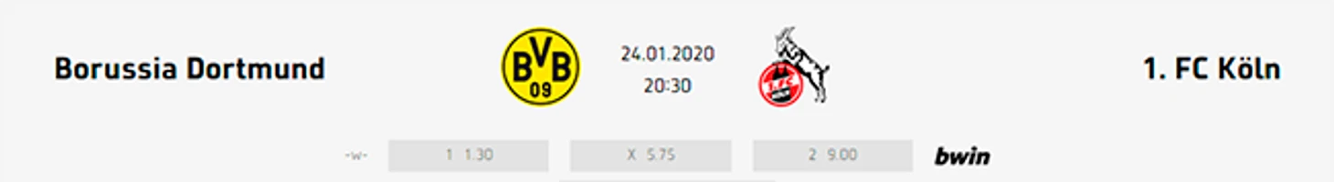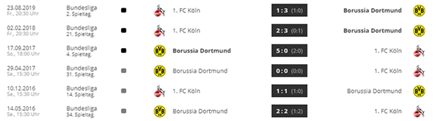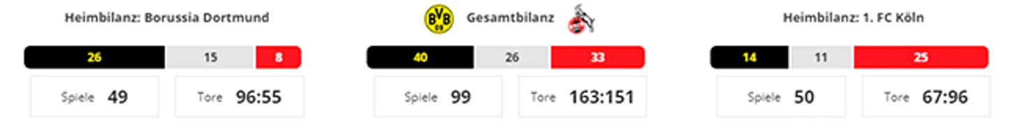 «Дортмунд» непобедим уже шесть матчей против «Кёльна» (три победы, три ничьи). Дома они не проигрывали «Кёльну» с 1991 года, выиграв 15 матчей и сыграв вничью четыре. Это самая долгая беспроигрышная домашняя серия «Боруссии».