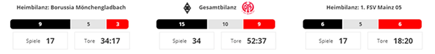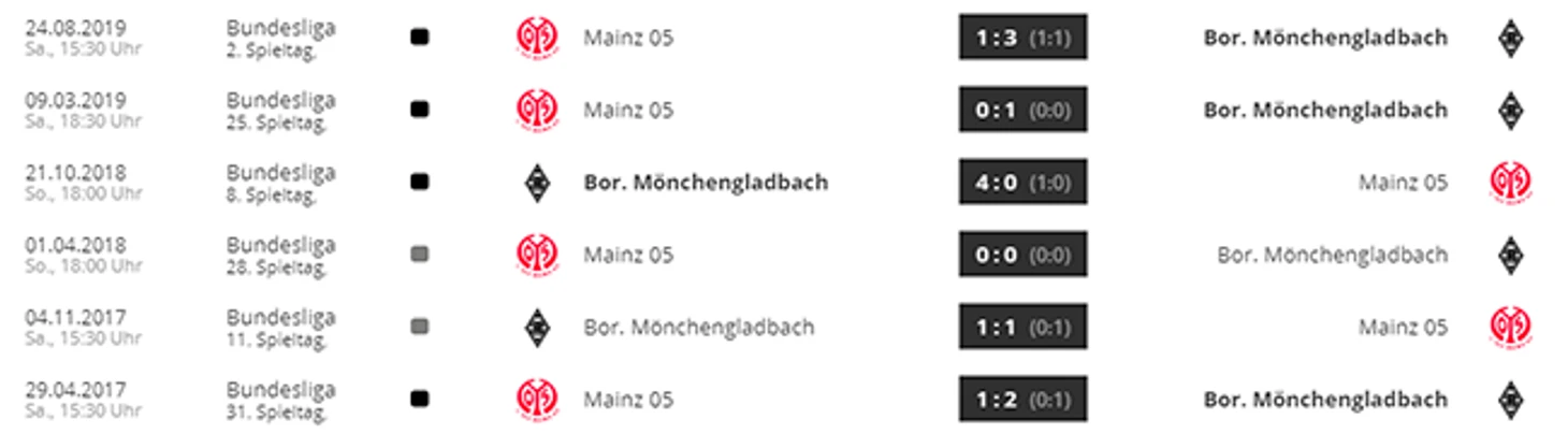 «Гладбах» не проигрывает уже семь матчей против «Майнца» (пять побед, две ничьи). Последний проигрыш «Боруссии» был четыре года назад, 29 января 2016 года, тогда «Майнц» выиграл дома со счётом 1:0.