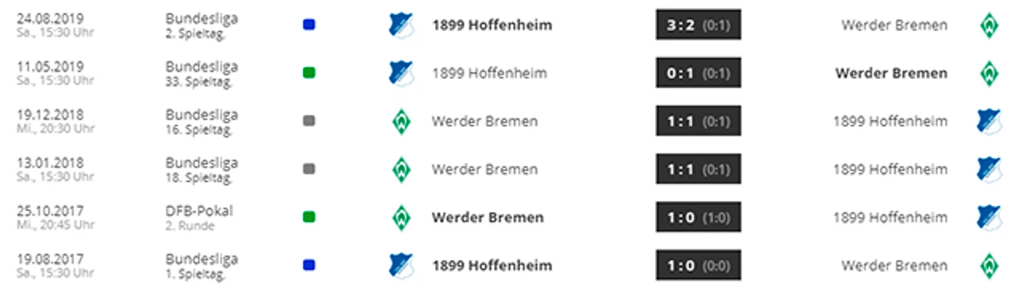 «Хоффенхайм» проиграл только одну из последних семи игр в Бундеслиге на выезде, выиграв четыре из последних пяти. В Бремене они выигрывали лишь однажды, но из своих последних восьми визитов проиграли только один (одна победа, шесть ничьих, одно поражение).
