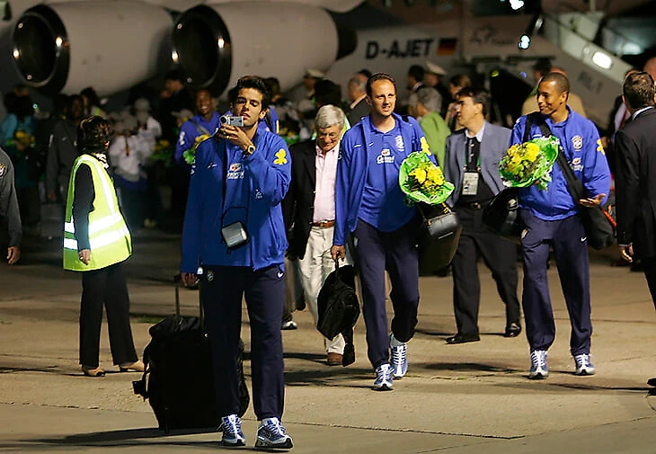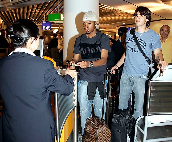 Аэропорт – редкое публичное место, где футболисты не выглядят суперзвездами. Как Робиньо и Кака на входе в самолет во Франкфурте после победы на Кубке конфедераций-2005.
