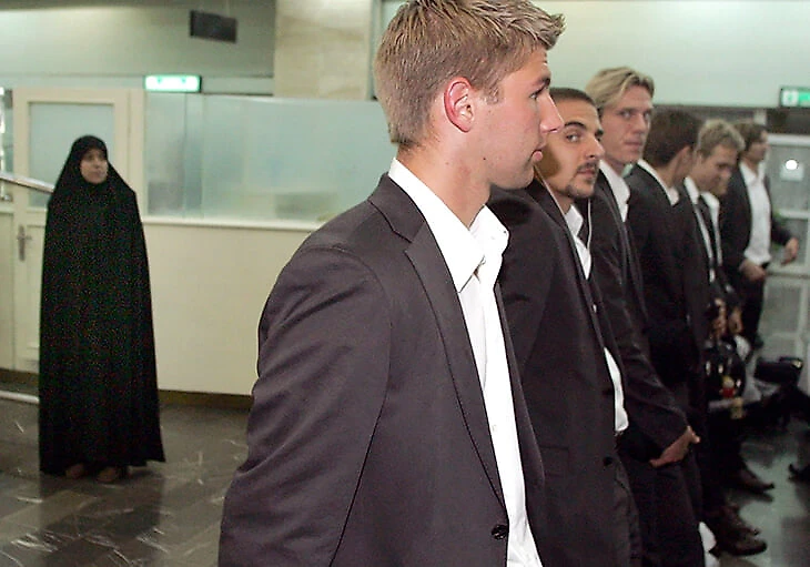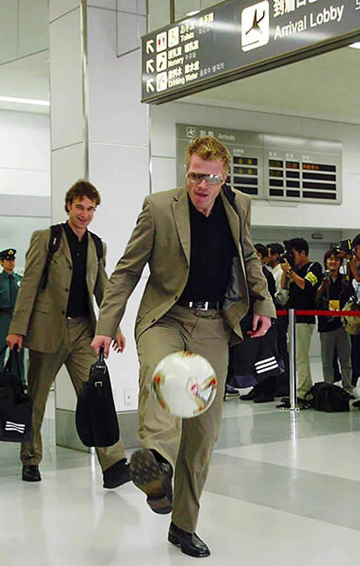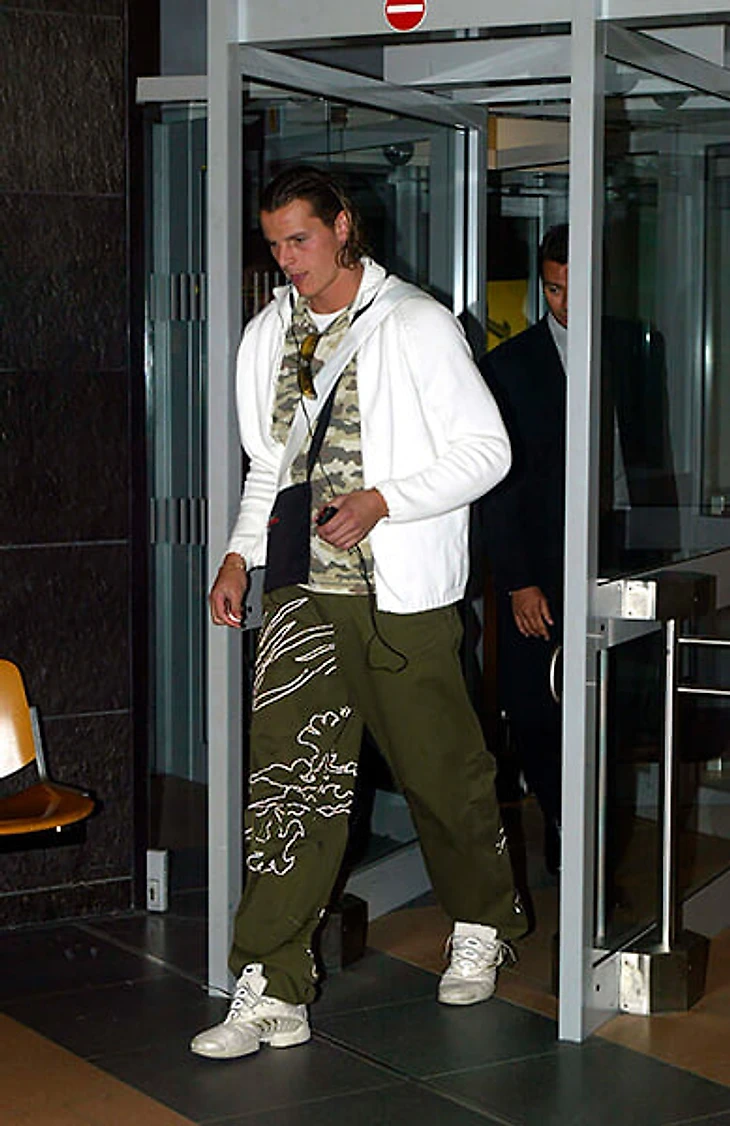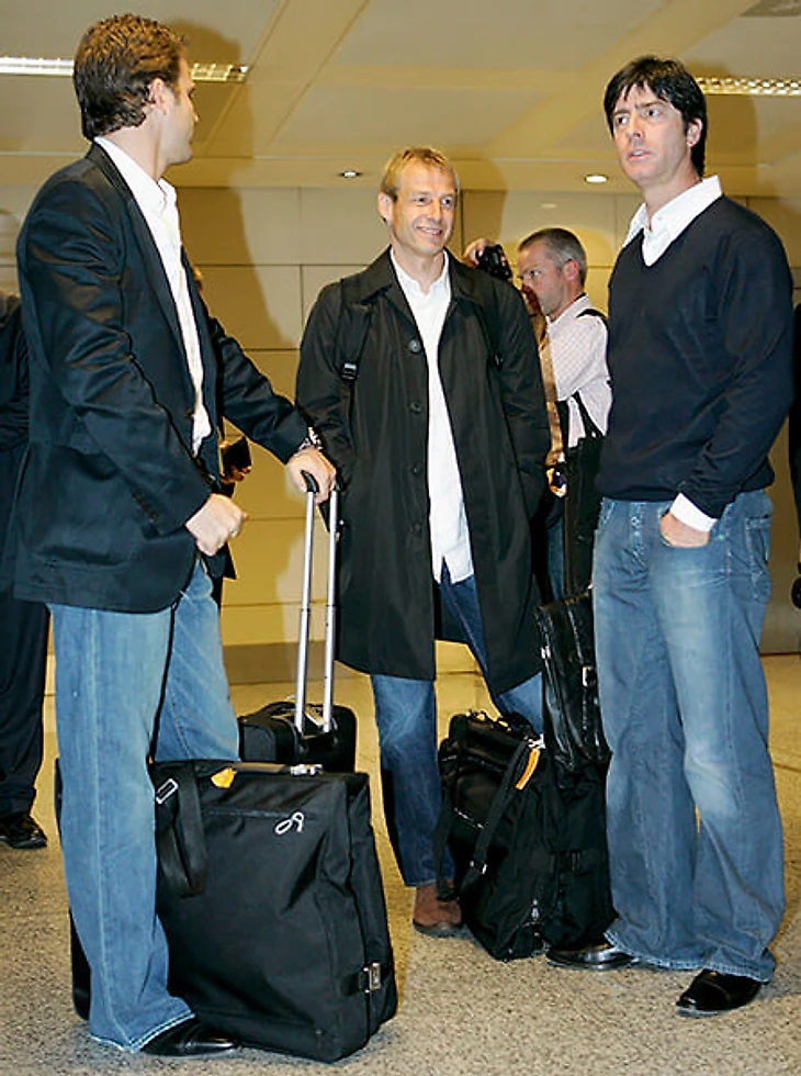 У ожидающих регистрации Клинсманна, Лева и Бирхоффа багажа больше. Судя по фото, в 2005-м в моде были невероятно широкие и длинные джинсы.