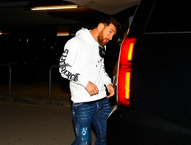 Месси вытаскивает вещи из авто. Летит с семьей в отпуск.