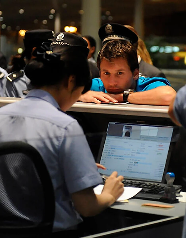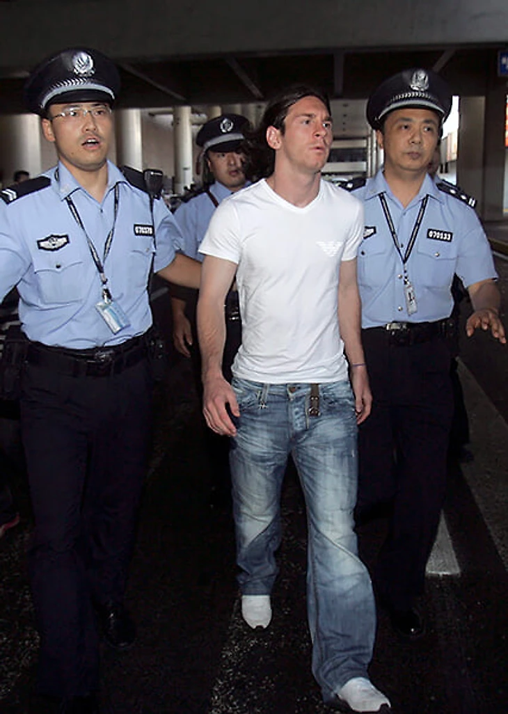 А трое полицейских не сопровождали в зале прилета Шанхая, как Месси.