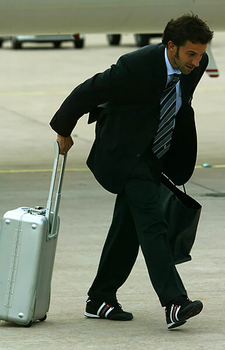 Дель Пьеро раскорячился с чемоданом в аэропорту Манчестера.