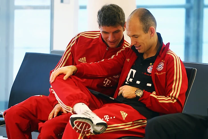 Зал ожидания. Мюллер и Роббен перед полетом залипают в планшет.