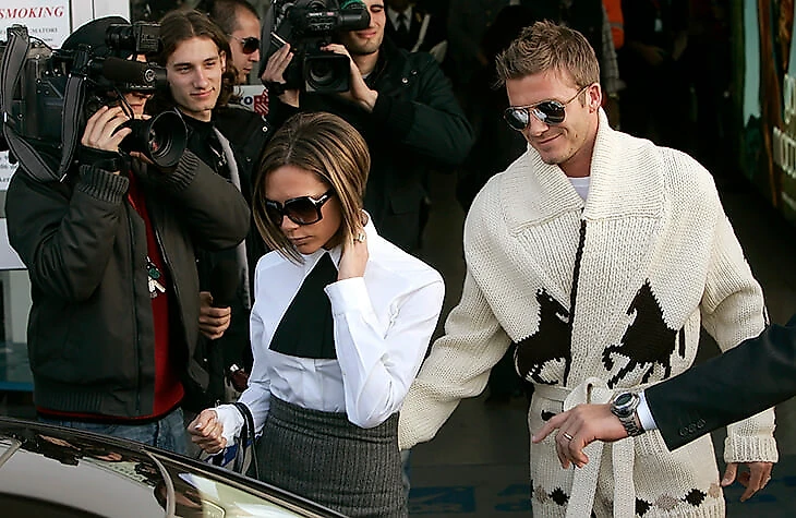 Другой шикарный британец. Рим. Дэвид (в шерстяном халате) и Виктория по пути на свадьбу Тома Круза и Кэти Холмс.