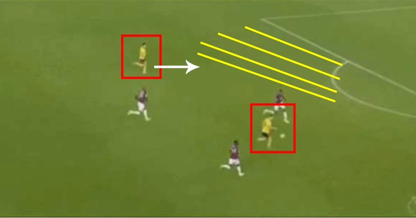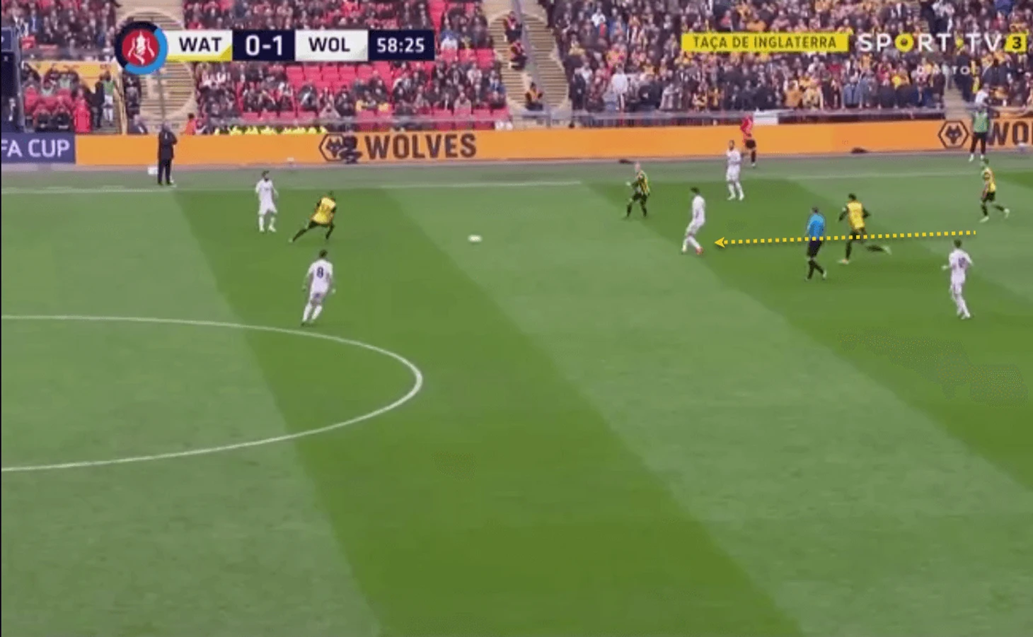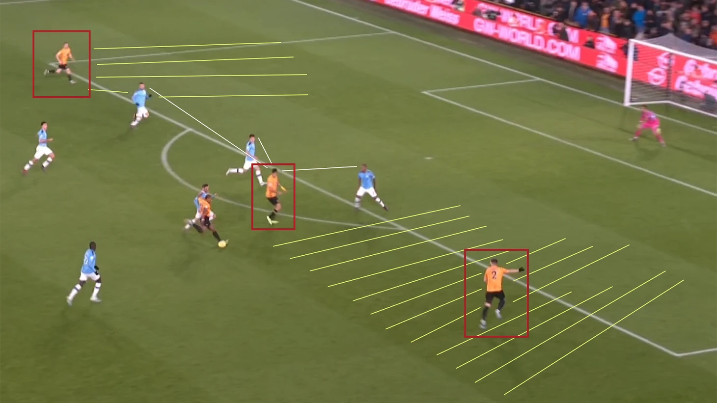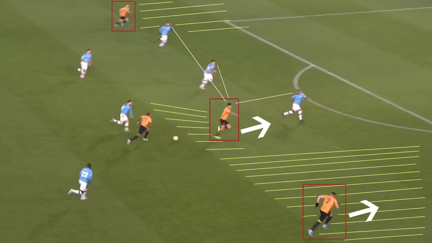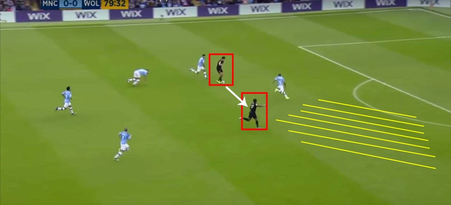В этом случае (помимо очевидной недоработки в защите Менди), видно как Рауль, контролирует Фернандиньо и не дает тому возможности перехватить передачу на Доерти. Посмотрите на первую картинку, где Хименес заставляет игроков “Сити” оставить правый фланг незащищенным, позволяя Траоре отдать удобную передачу на вбегающего в штрафную защитника “волков”. Здесь мы видим и роль флангов, и саму функцию Рауля как некой приманки, стягивающей защитников на себя за счет умного движения мексиканца по центру поля.
