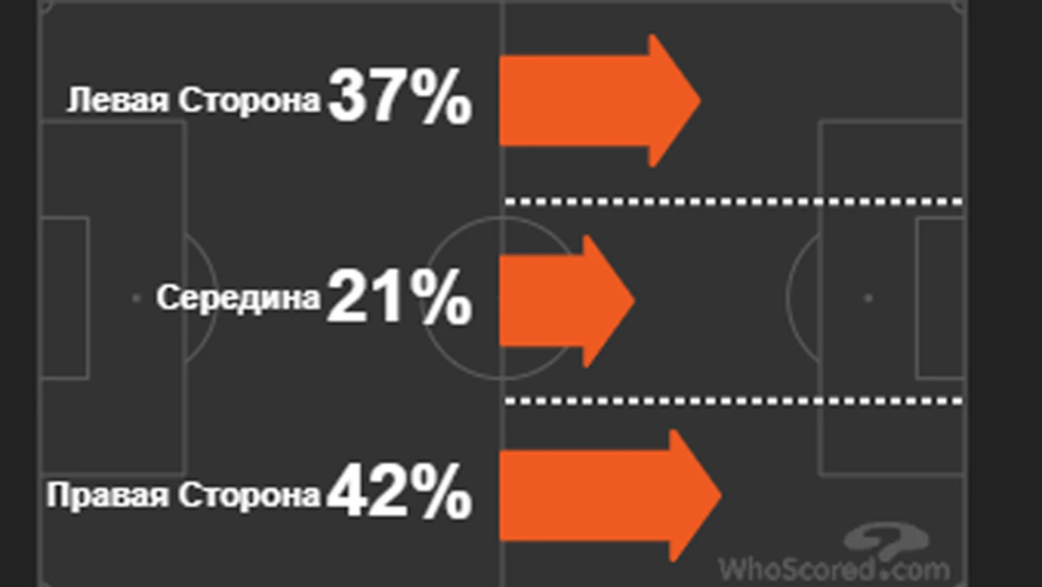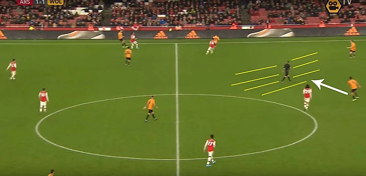(Наглядный пример “связующей” роли Хименеса. Стрелка показывает не цель мексиканской ракеты, а направление движения: Хименес идет на передачу верхом, "Вулвз" выходят из под прессинга "Арсенала")