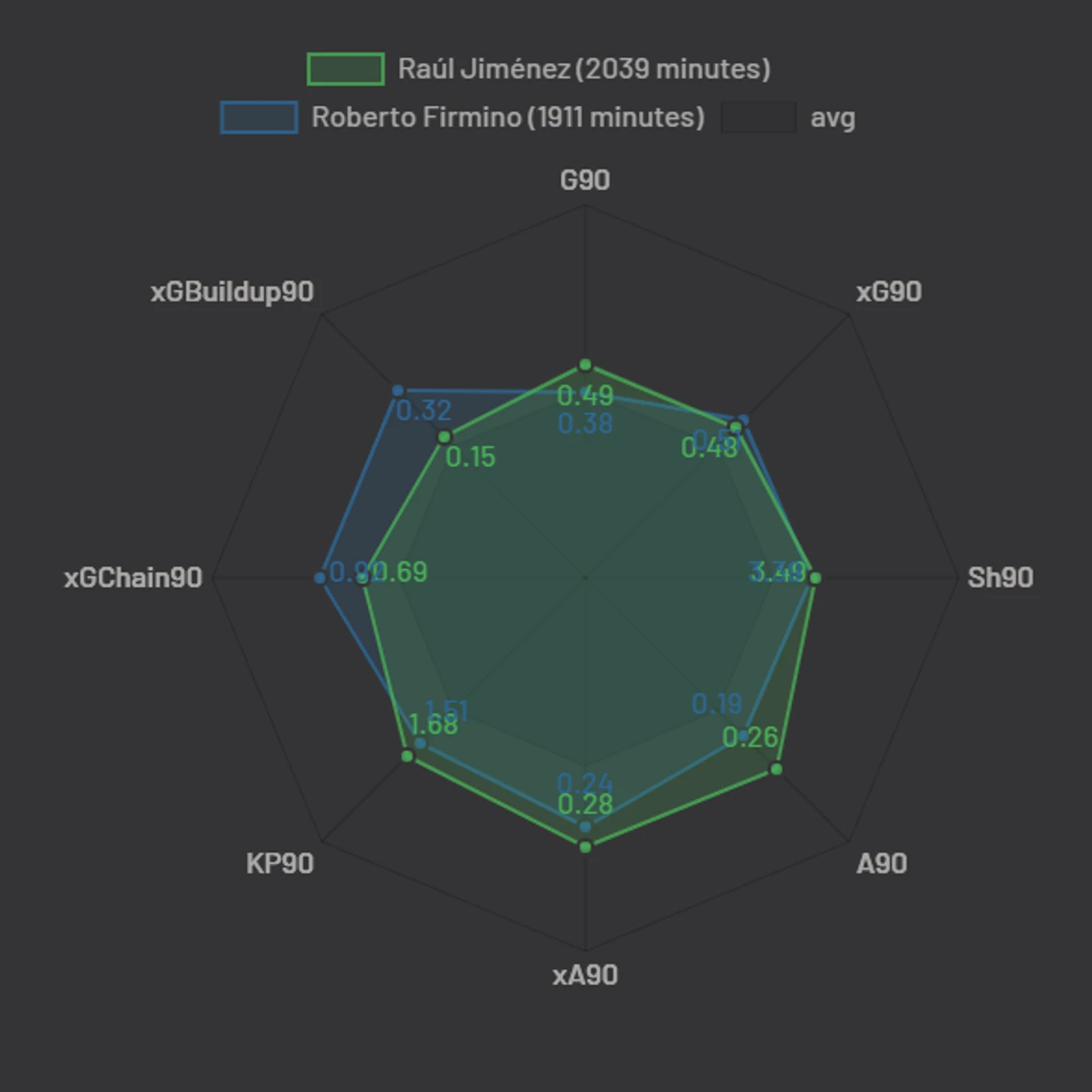 В связи с этим интересно сравнить этих игроков по вкладу в игру. Ниже вы можете увидеть таблицу с различными статистическими показателями Раулем Хименеса и Роберто Фирмино: