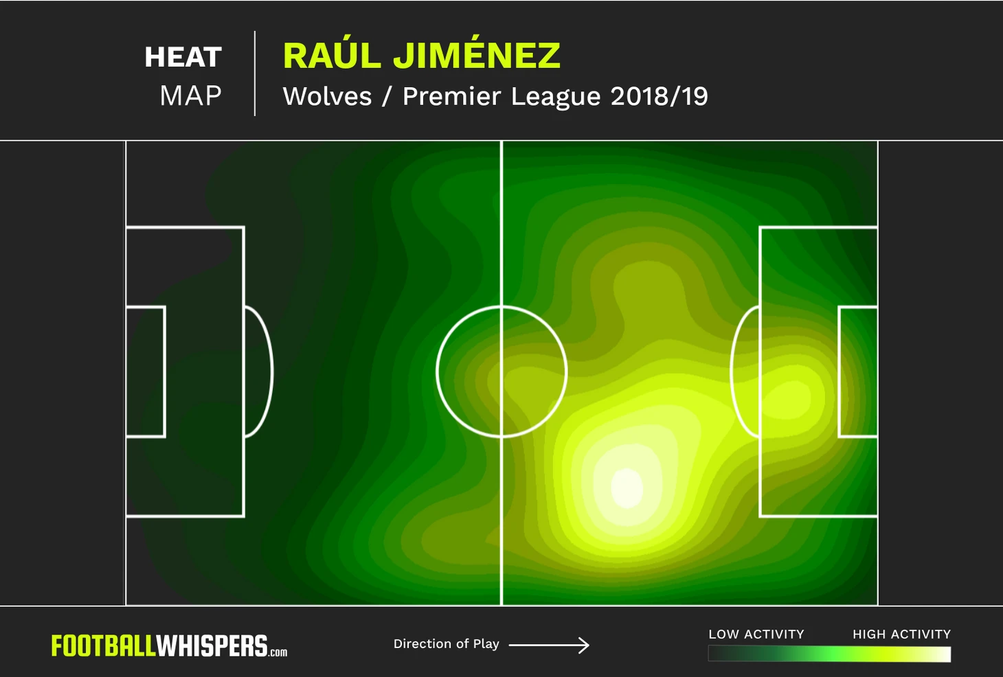 Для начала взглянем на игру Рауля формата сезона 18/19, когда команда играла по схеме 3-5-2. При такой расстановке у Хименеса было несколько задач: играя на позиции одного из форвардов, он смещался во фланг где помогал в построении атаки, если там не хватало усилий крайних защитников, а при обороне заставлял соперников атаковать через фланги, где у “волков” было численное преимущество. Все это можно увидеть по тепловой карте движений Рауля за предыдущий сезон:
