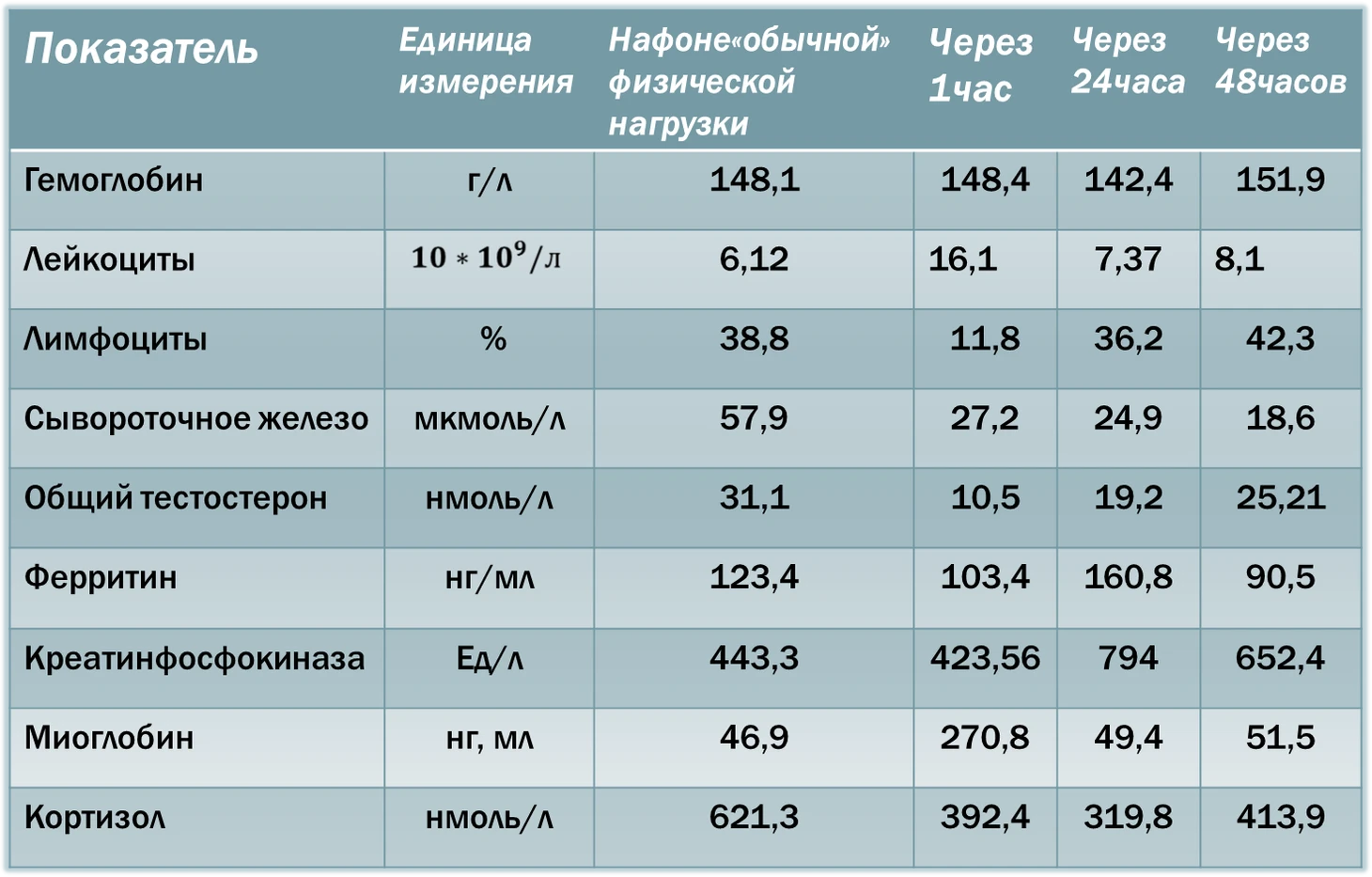 Изменения показателей крови особенно выражены в первые часы после нагрузки, и их восстановление происходит в течение 48 часов.