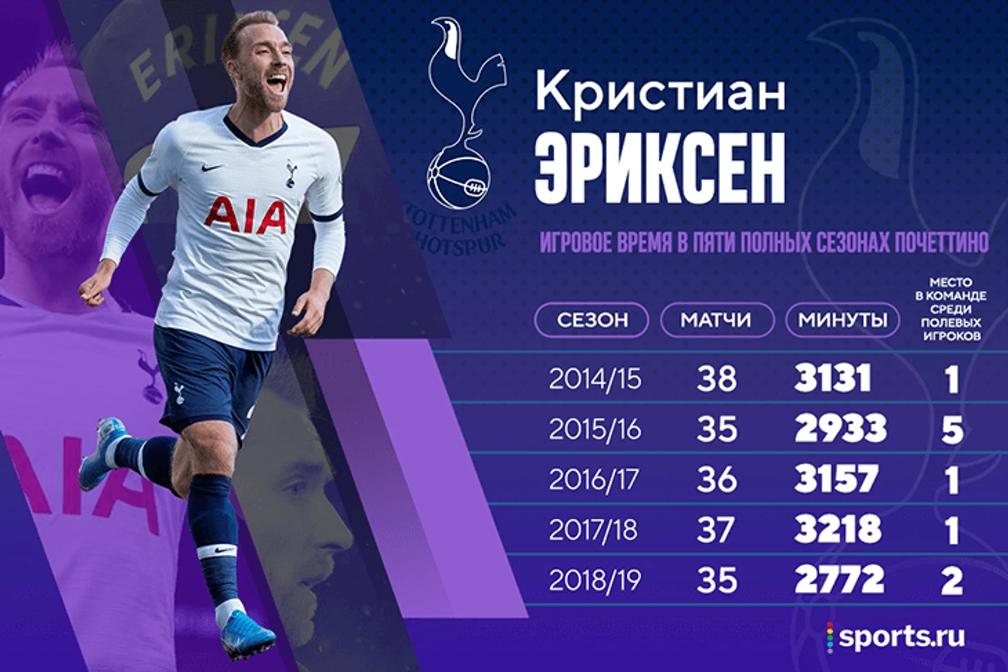 Эпоха Почеттино – самое успешное время для этого «Тоттенхэма». Эриксен был одним из ее символов, самым востребованным и важным звеном. «Когда Кристиан не играет, мы не похожи на себя. Он связывает все», – говорил Дэнни Роуз. Молчаливое лидерство Эриксена не всегда бросалось в глаза со стороны, но для болельщиков «Тоттенхэма» это не было проблемой: фанаты дважды называли датчанина игроком года (в 2017-м Эриксен обошел Кейна, забившего 35 мячей).