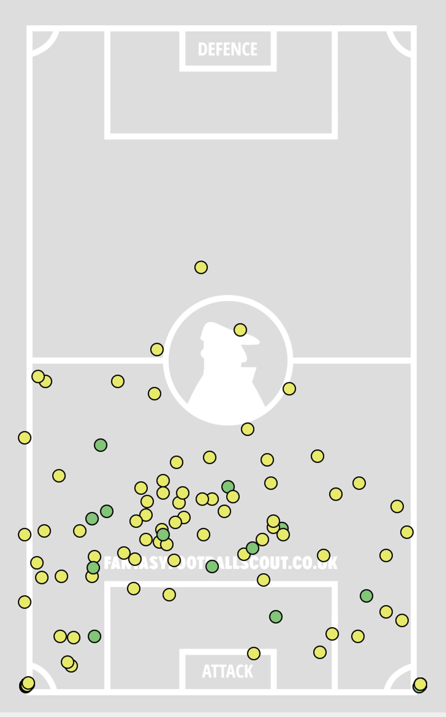 Вот, например, карта созданных Эриксеном моментов в сезоне-2016/17 (ассисты – зеленые, три с угловых запрятались под желтыми кружками).