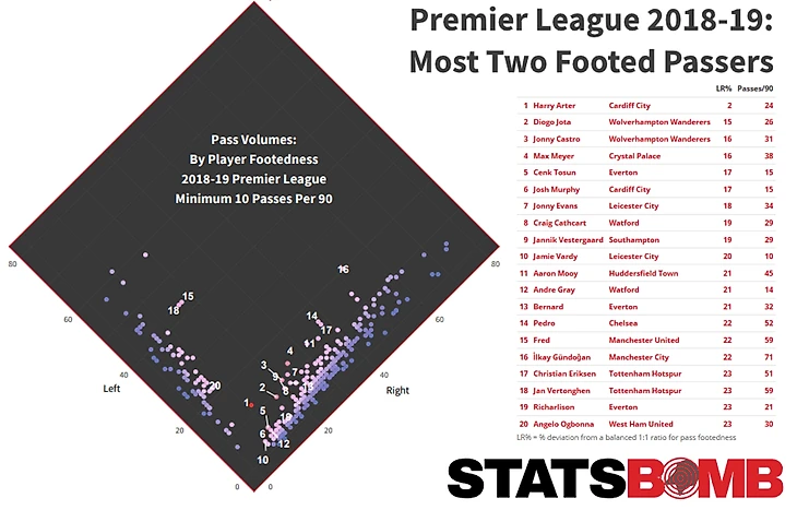 Двуногость Эриксена показывает и исследование StatsBomb. Там сделали упор не на удары и голы, а пасы. На картинке – 20 игроков, которые в прошлом сезоне чаще остальных пасовали с двух ног. Кристиан – 5-й среди центральных/атакующих полузащитников (чем выше процент, тем большее отклонение от идеального соотношения 1:1. У Эриксена на 100 передач левой приходится 123 паса правой).