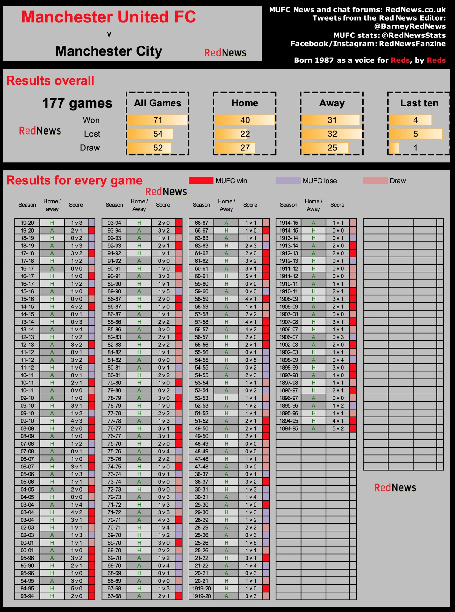 На данный момент «МЮ» побеждал в 71-м матчей, «МанСити» – в 54-х + было зафиксировано 52 ничейных результата.