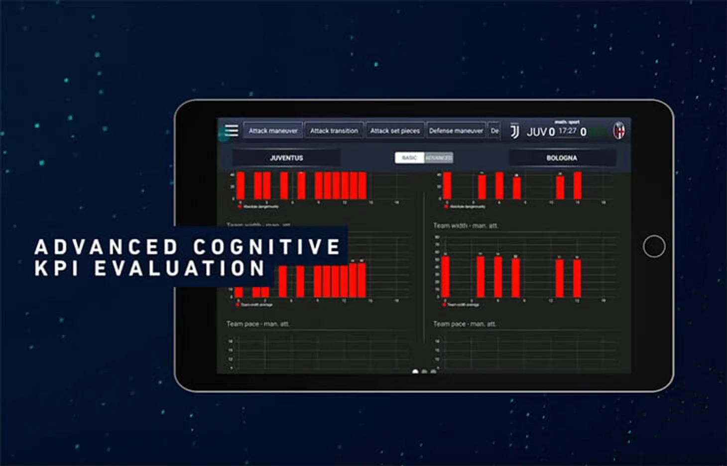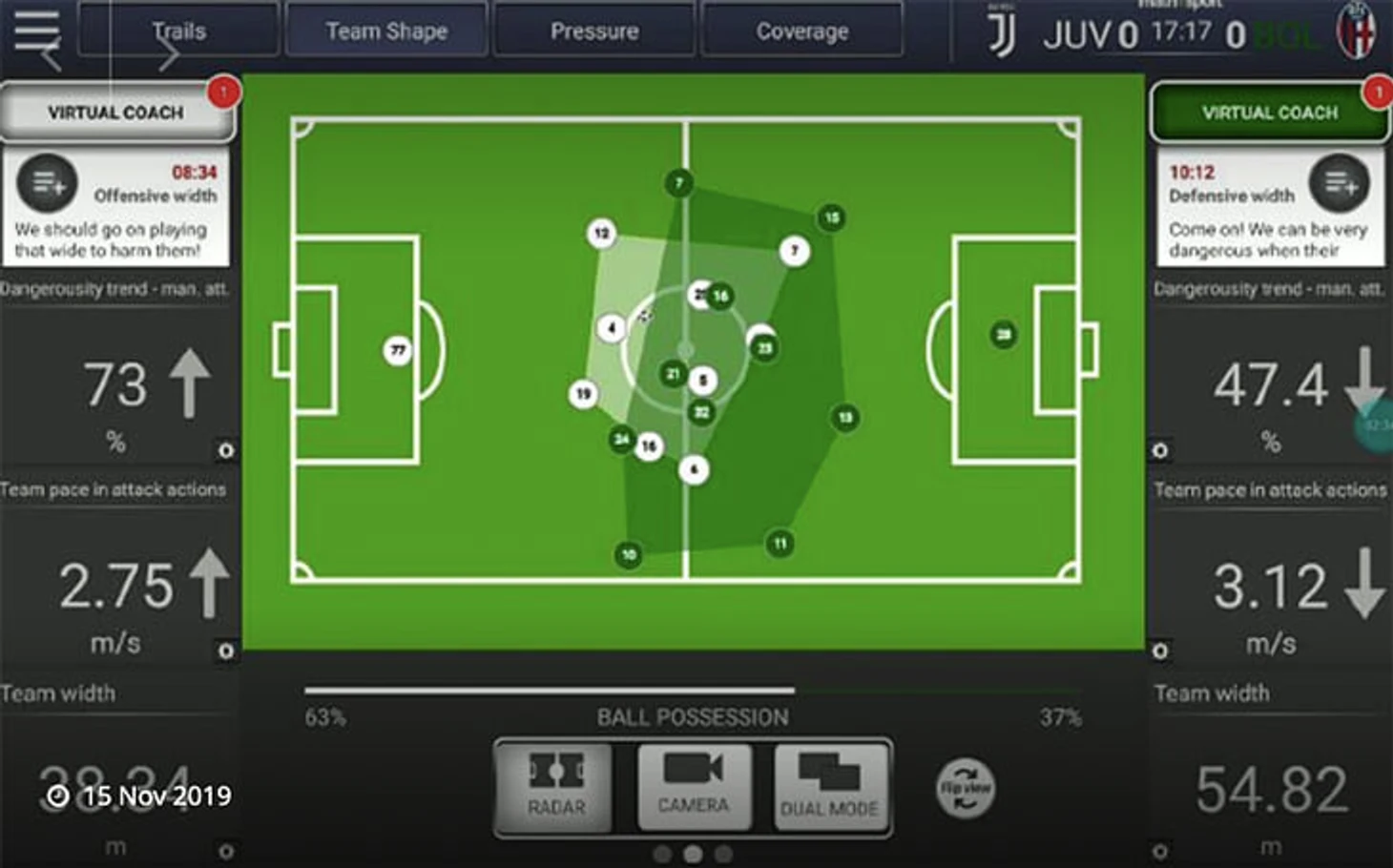 Среди параметров, которые может отслеживать в реальном времени Virtual Coach: скорость атак команды, ширина расположения игроков, индекс опасности атак, скорость движения мяча, количество передач на чужой половине поля, количество ударов после позиционных атак, уровень прессинга и еще много чего. По каждому параметру можно задать нормы и во время матча видеть отклонения от игрового плана. «Мы хотим, чтобы все были в равных условиях: и «Ювентус», и СПАЛ, – говорят в Math&Sport.