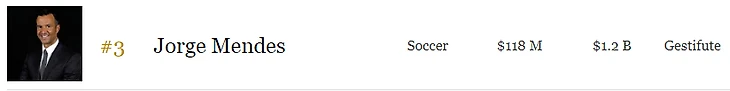 Если Борас является мастодонтом в бейсболе и по сумме заключаемых сделок , то Жорже Мендез называют титаном футбольного бизнеса, в числе его клиентов Криштиану Роналду(Ювентус), Хамес Родригез (Бавария),Анхель Ди Мария (ПСЖ), Диего Коста (Атлетико Мадрид),Бернарду Силва(Манчестер Сити) , Эдерсон (Манчестер Сити), Жоао Канселу (Ман Сити) и тд. Всего компания Gestifute возглавляемая Мендезом ведет дела 122 футболистов. Самая крупная сделка компании - это переход Роналду из Реала в Ювентус. Доход компании составил 118 млн $ , всего в 2019 году Мендез заключил сделок на сумму 1.2 млрд $.