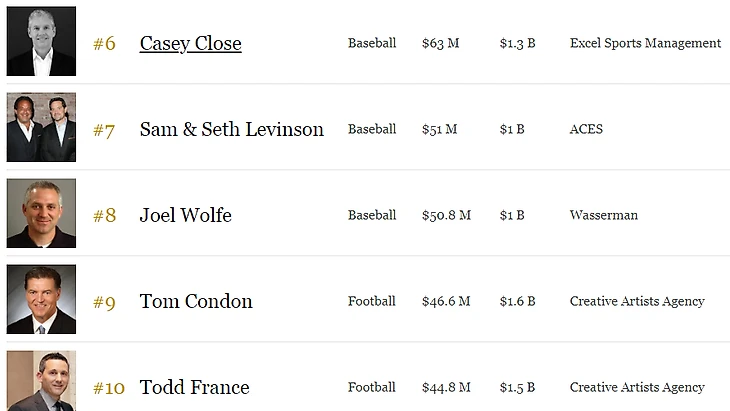 В топ 10 рейтинга так же входит 3 бейсбольных агента и 2 агента по американскому футболу