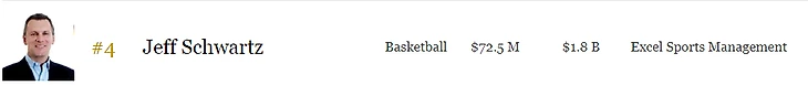 Джефф Швартц - аналог Мендеза в баскетболе, уже 5 год подряд возглавляемое им агентство Excel Sports Management получает самые большие прибыли от баскетбольных контрактов. Среди клиентов Швартца такие баскетболисты как: Jamal Murray, Nikola Jokic, Khris Middleton и Kevin Love, всего в агентстве ведут дела 53 баскетболистов. В прошлом году агентство заключило 6 сделок на сумму не менее 100млн $ , в общей сумме заключено контрактов на сумму 1.8млрд $ , агентская комиссия составила 72.5 млн $, которая и позволила Швартцу занять 4 строчку рейтинга