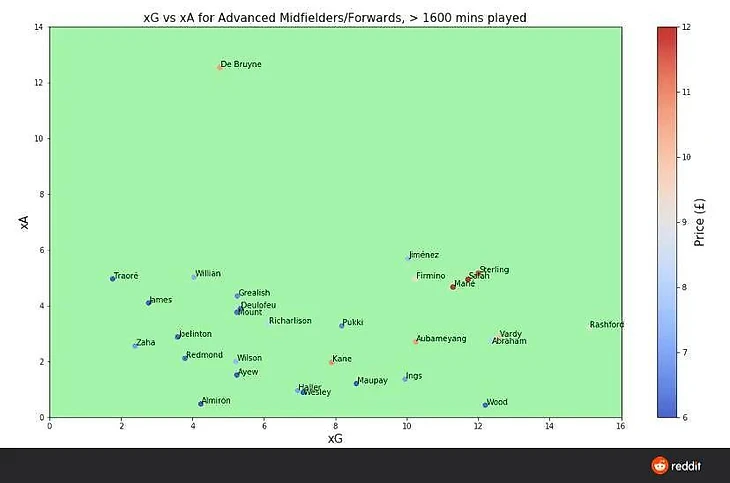 Градация игроков по xG (горизонтальная ось) и xA (вертикальная ось). Цвет обозначает цену игрока (чем краснее, тем дороже). Минимум 1600 минут сыграно.
