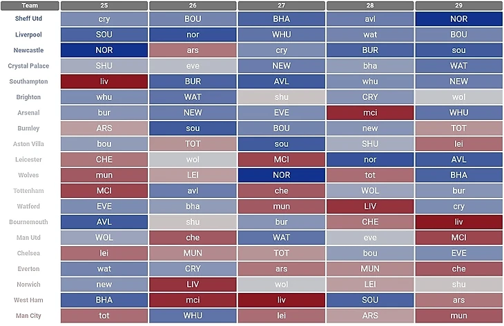 Календарь на ближайшие 5 туров. Шеффилд и Астон Вилла пропускают 28 тур. Ман. Сити и Арсенал тоже не будут играть в 28 туре. Сортировка по сложности:
