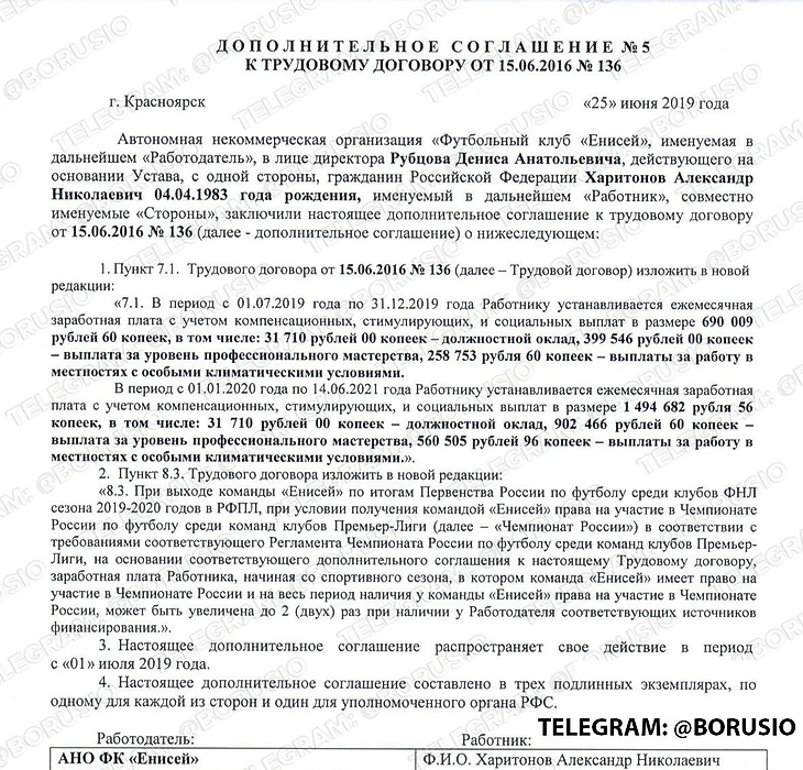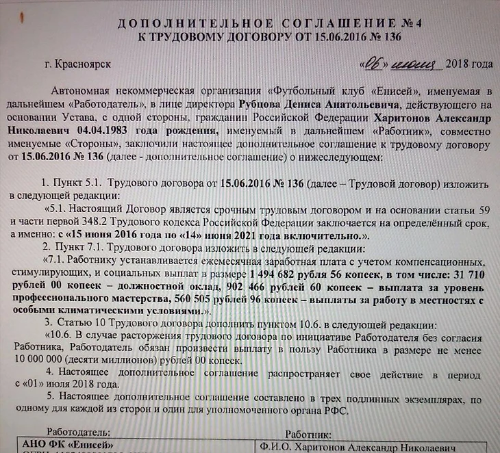 Тем временем в ходе информационной войны в Енисей были опубликованы контракты некоторых игроков. По ним ветеран команды 36 летний Харитонов получал зарплату в почти полтора миллиона рублей. Бонус за расторжение - 10 миллионов.