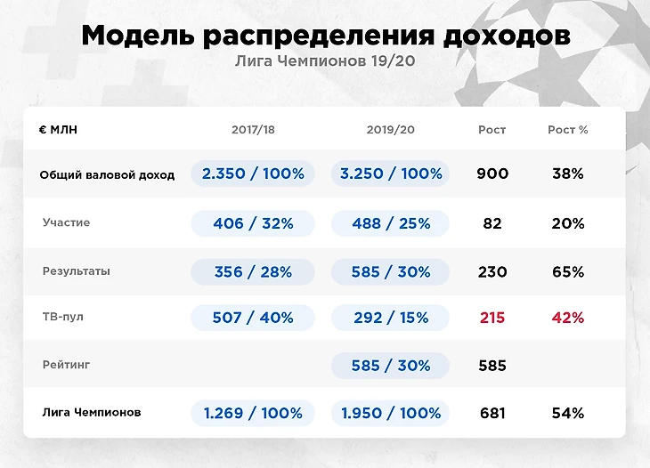 Валовой коммерческий доход УЕФА за сезон 2019/2020 оценивается в €3,25 млрд. Из этой суммы €1,95 млрд. подлежит распределению между клубами, участвующими в Лиге чемпионов, а остальная часть будет использована для покрытия административных расходов и выплат участникам других турниров под эгидой ассоциации.