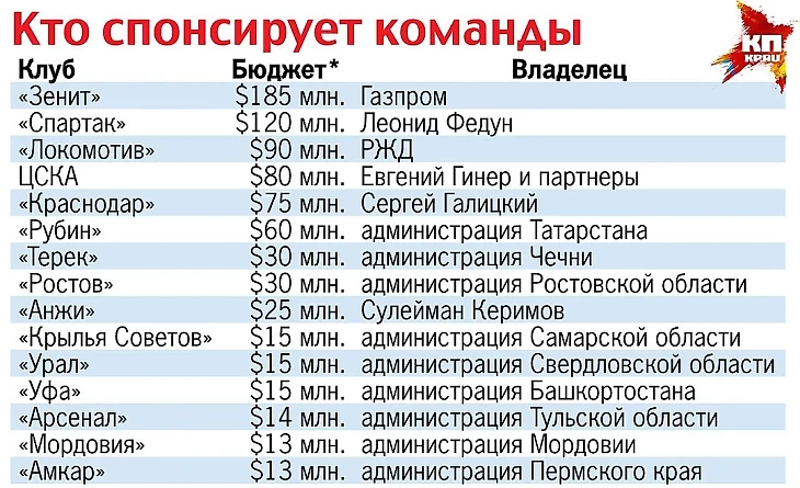 Большинство команд, принадлежат субъектам нашей страны. В итоге, команды выкачивают из бюджета средства, а после прекращения финансирования умирают. Частным командам пробиваться в РПЛ практически невозможно, пример Галицкого и его Краснодара не должен быть единичным, если мы хотим, чтобы наш футбол развивался, но сейчас это практически невозможно.