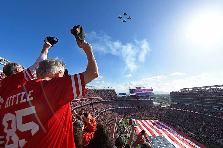 На предматчевые церемонии 49ers неизменно приглашаются всевозможные звезды, каждая встреча предваряется развертыванием национального флага, на некоторое время покрывающего все пространство игрового поля, исполнением гимна, а также пиротехническим и авиашоу с участием истребителей ВВС США, весьма сложным в организации из-за соседства стадиона с гражданским аэропортом.