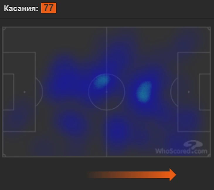 Но круглого он получал не так уж и часто, потому что не умеет он еще хорошо открываться под передачи партнеров, находить свободное пространство и использовать его. Он отдает передачу и вместо того, чтобы выйти под партнера или открыться в свободную зону - он закрывается. Забегает за игрока или за двоих игроков, и барражирует там без пользы. Но спишем это на молодость.