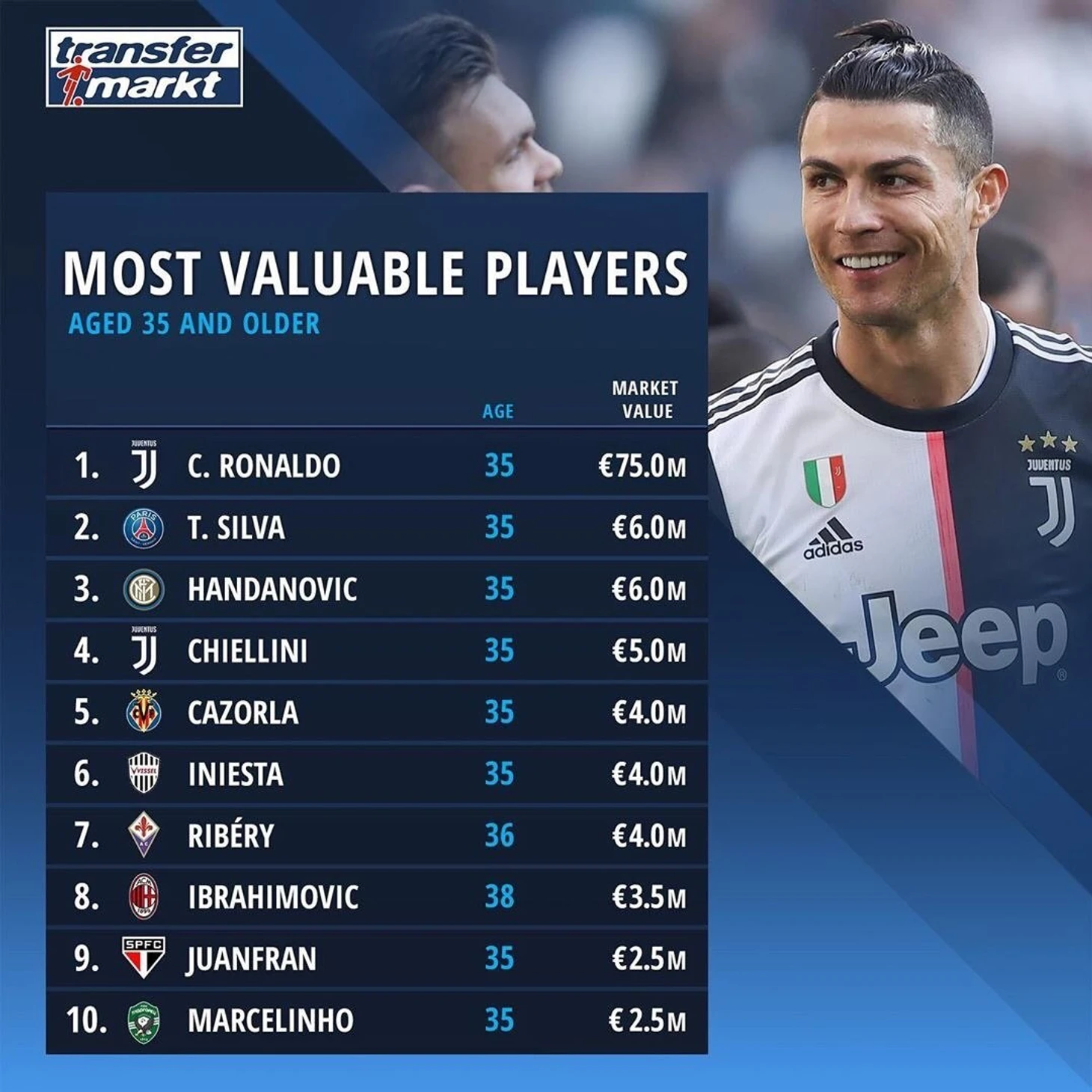 Вчера был день рождения у Криштиану Роналду, в честь 35 летия популярный ресурс выпустил рейтинг футболистов в возрасте 35 лет. Самым дорогим футболистом стал конечно же португалец))