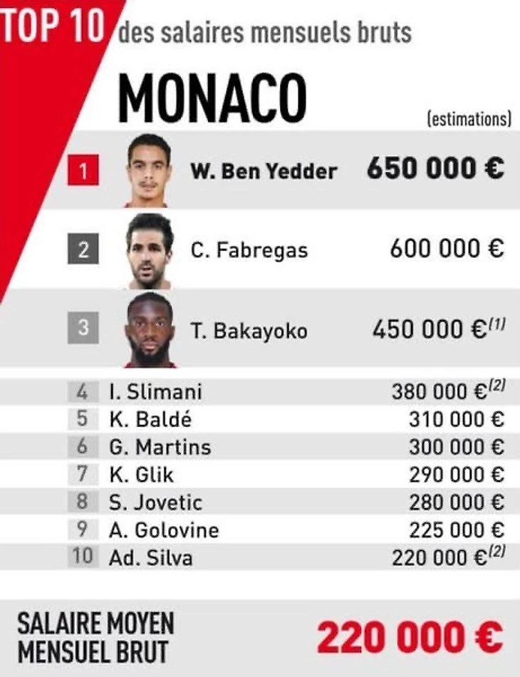 Среди игроков «Монако» самая большая зарплата у нападающего Виссама Бен Йеддера — 650 тыс. евро в месяц.