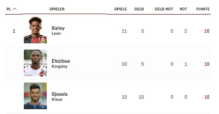 *игрок – кол-во игр – желтые – 1+1 желтые – красные – всего