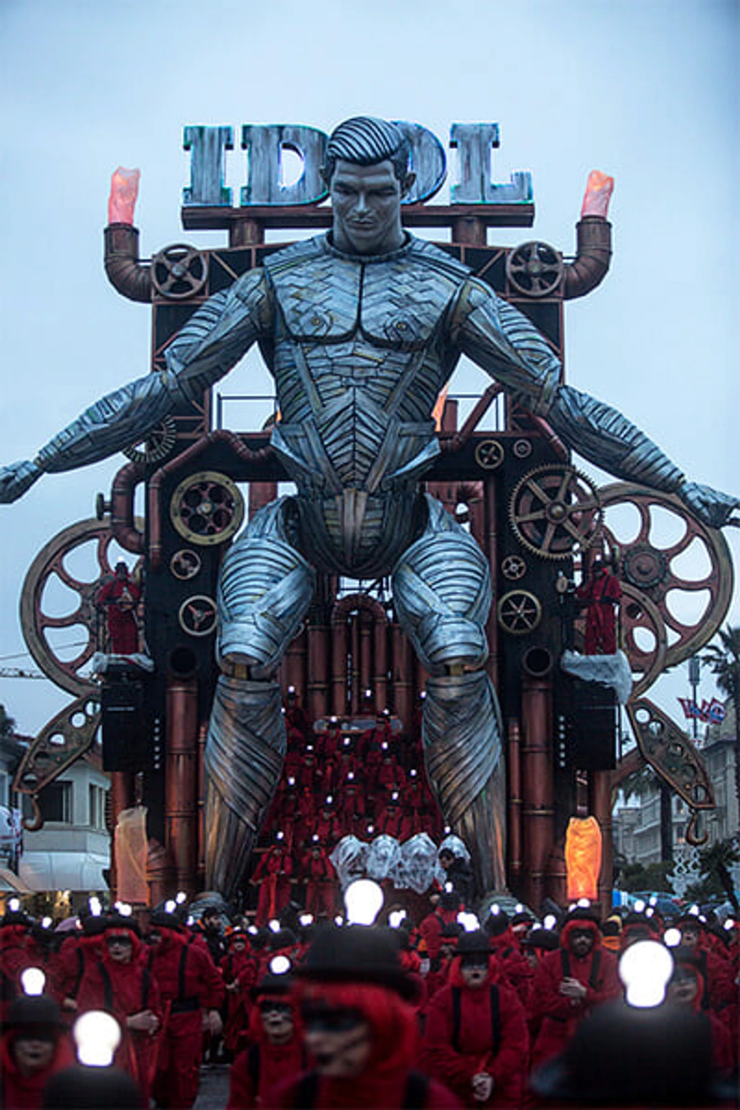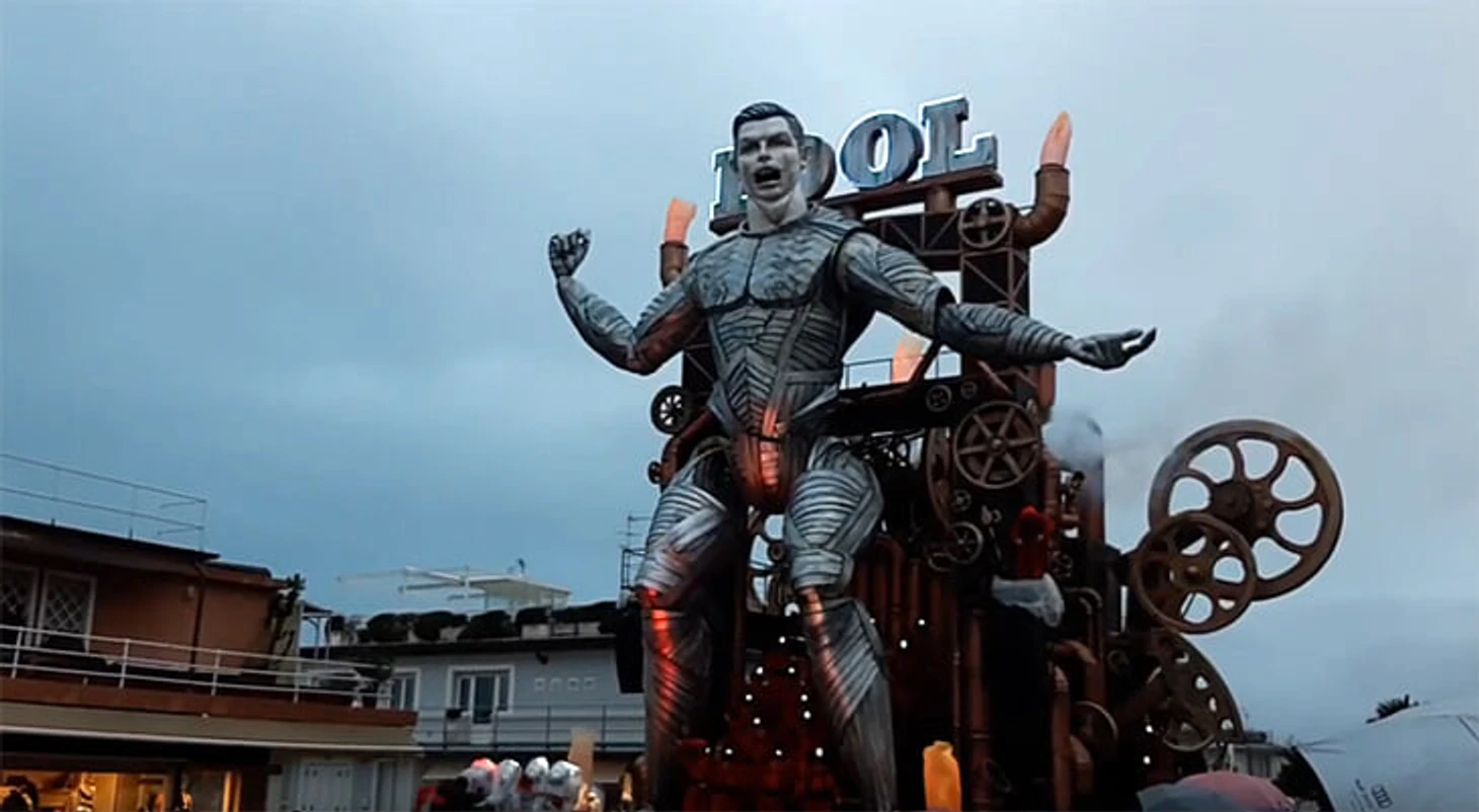 На карнавале в Виареджо показали гигантскую фигуру Роналду из папье-маше. Она двигается и похожа на железного человека