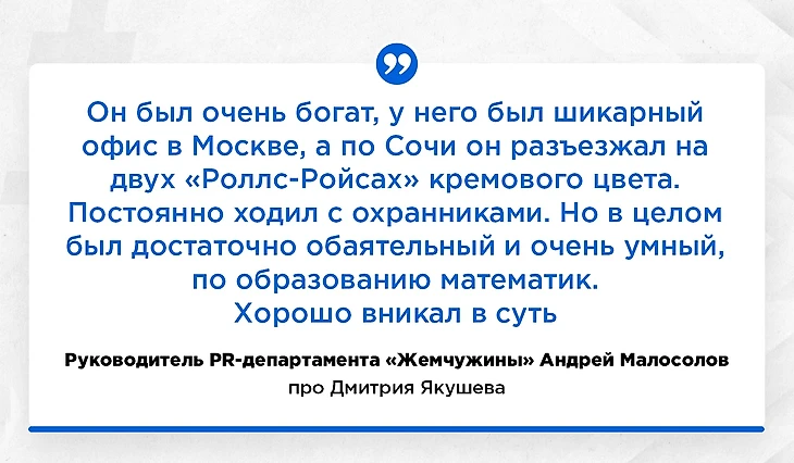 На той самой пресс-конференции в гостинице “Жемчужина” (какое неожиданное совпадение), игрокам был представлен новый административный состав и новое название – “Жемчужина-Сочи”. Президентом стал бизнесмен Дмитрий Якушев, который получил следующую характеристику.