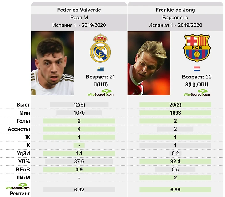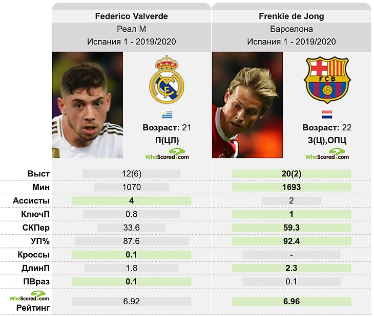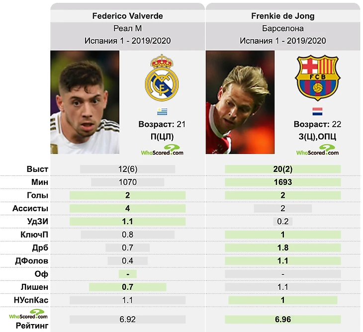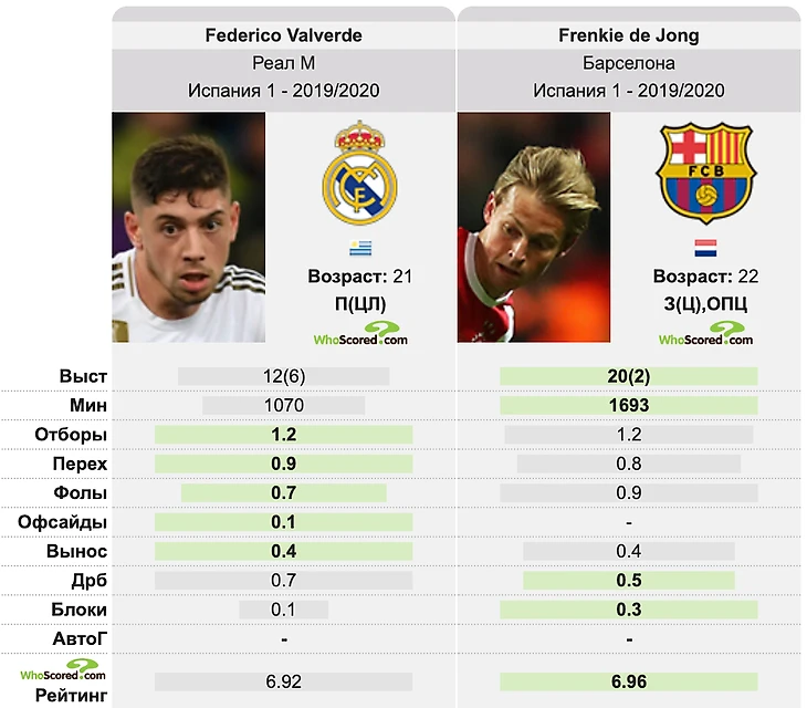 Голландец чуть чаще отдает ключевые передачи. Он чаще пускается в дриблинг (хотя те, кто наблюдает за матчами "Реала" замечают, что Феде здорово прибавляет в этом компоненте в последних играх). На де Йонге чаще фолят (забавно, так как в последних матчах Вальверде опять же отбили все ноги)