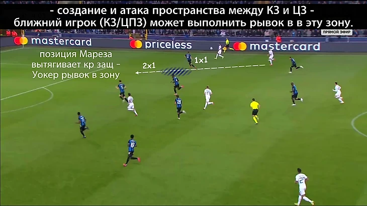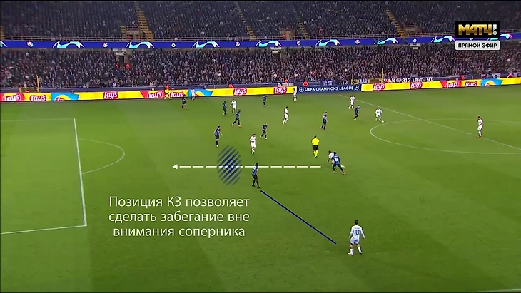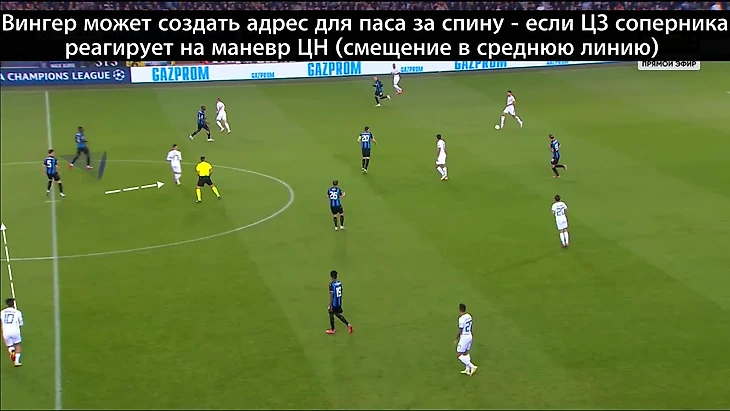 Во-вторых, при владениях мяча на фланге, игра в этой позиции позволяет заполнять свободные зоны в первой линии атаки - то есть врываться в зоны между крайним и центральными защитниками соперника.