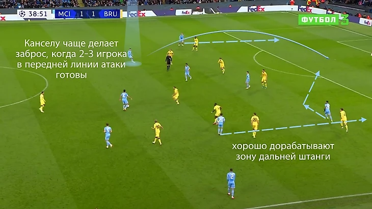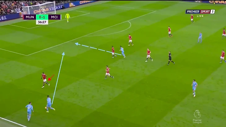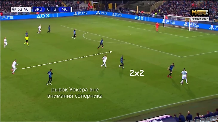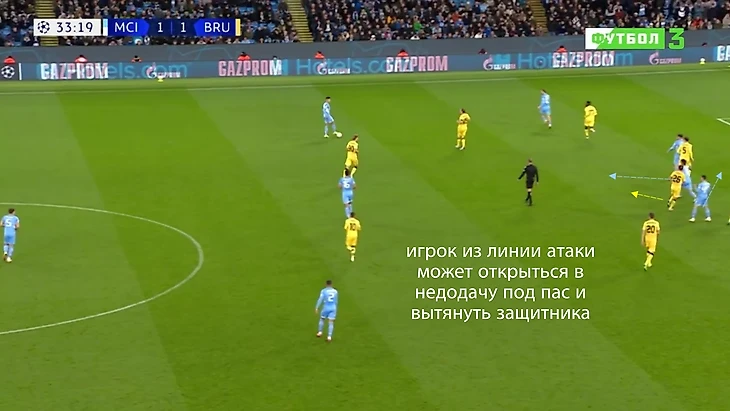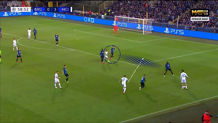 Если же центральный защитник соперника реагировал на маневр “фальшивой девятки” и следовал за нападающим МанСити, то вингер мог выполнить рывок в свободную зону, создав адрес под передачу за спину.
