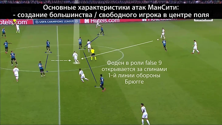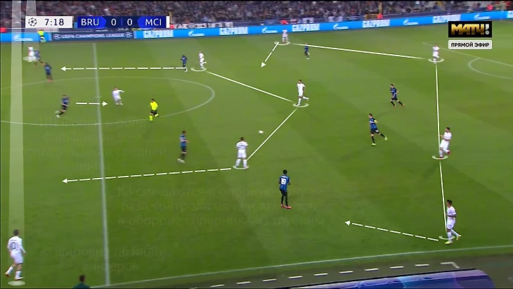 В играх против Брюгге и МЮ (которые были использованы для анализа) Гвардиола использовал игрока в роли фальшивой девятки, который смещался в полузащиту и позволял получить преимущество в середине поля - свободного игрока в центре поля. В первой игре против Брюгге (оборонялись в 4-2-3-1) получалось успешно найти пространство между линиями опорных и атакующих полузащитников бельгийцев и время для оптимального варианта продолжения атаки.