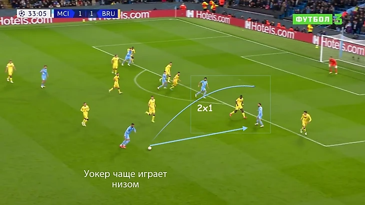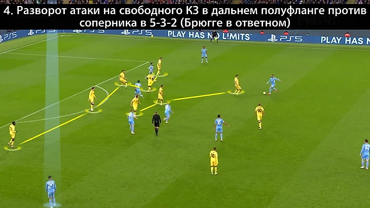 В-третьих, в играх против соперника, который обороняется в 5-3-2 (как играл Брюгге во второй игре и МЮ в 1 тайме) их позиции позволяли давать адрес для разворота атаки - переводить мяч на дальний полуфланг. Линия полузащиты соперника не успевает закрыть все пространство. При обороне 5-3-2 Брюгге успешно накрывали Фодена (за которым выходил один тройки центральных защитников) и было меньше разрывов между крайним и центральным защитником.