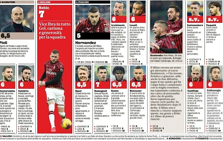 Анте Ребич (лучший игрок "Милана") - оценка 7 из 8. "Милан" искал человека, который будет забивать голы вместе с Ибрагимовичем, и он его нашел. Творческий и щедрый, также полезный в обороне - он забивает свой уже пятый гол в чемпионате и кубке Италии, что подтверждает его индивидуальное мастерство. Конечно, для победы над сильными соперниками необходим опыт, но как сказал Ибра после дерби: "Милан" не смог выиграть, но благодаря Ребичу он поверил, что сможет это сделать".