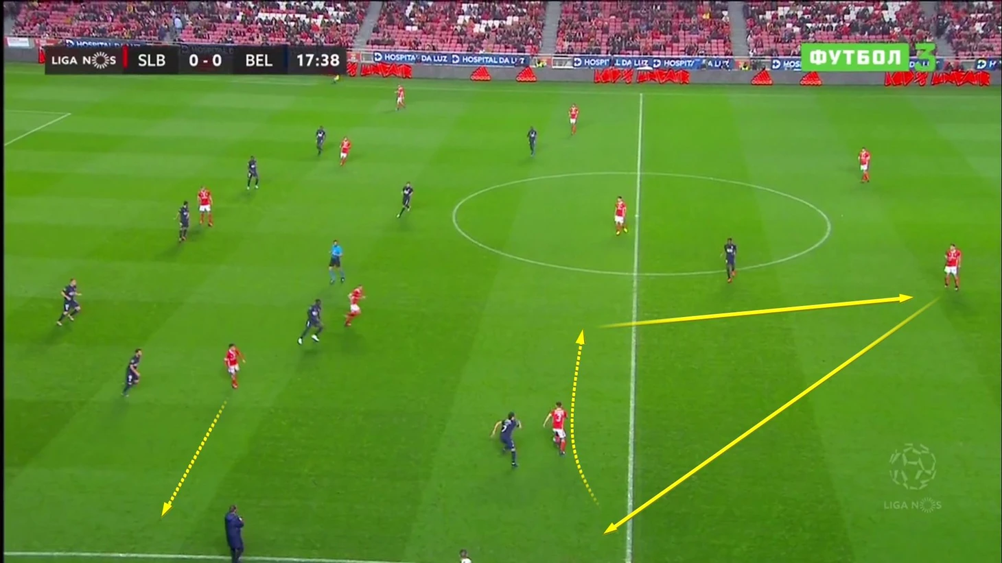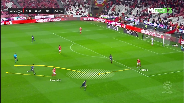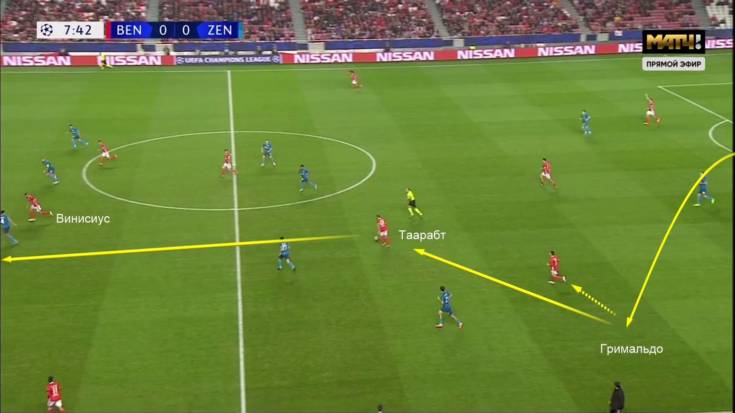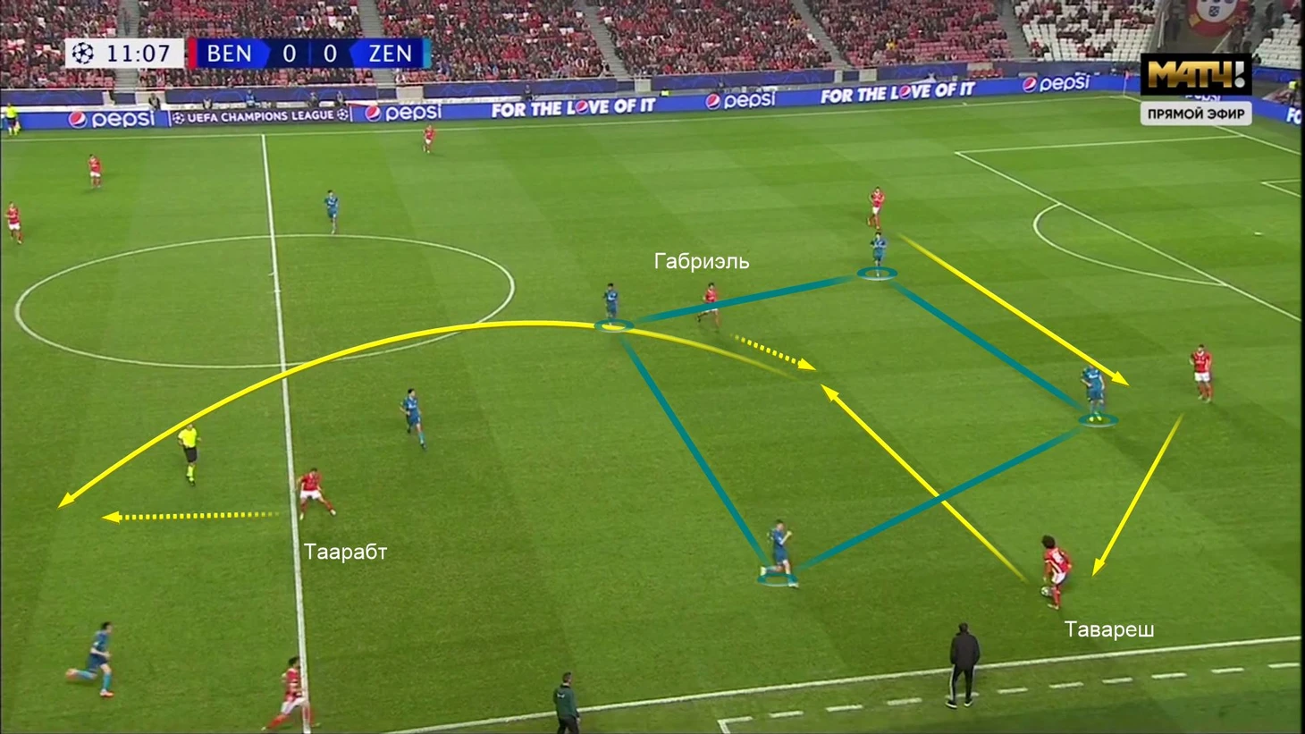 Вот еще классный пример, как Таарабт чувствует пространство и как грамотно туда открывается. На месте Габриэля будет Вайгль, просто тогда он еще не был игроком «Бенфики». Обратите внимание на то, что слева располагается Тавареш, то есть не стоит удивляться сменой флангами не только вингерами, а и крайних защитников.