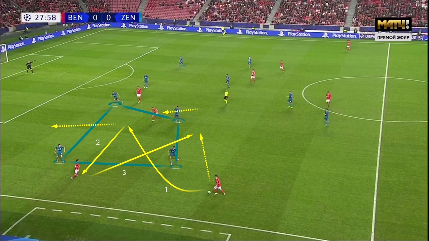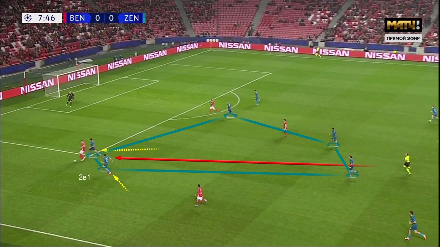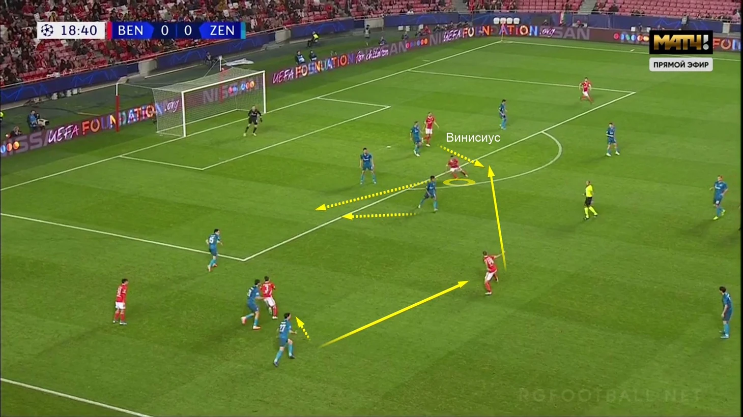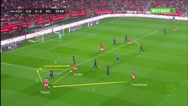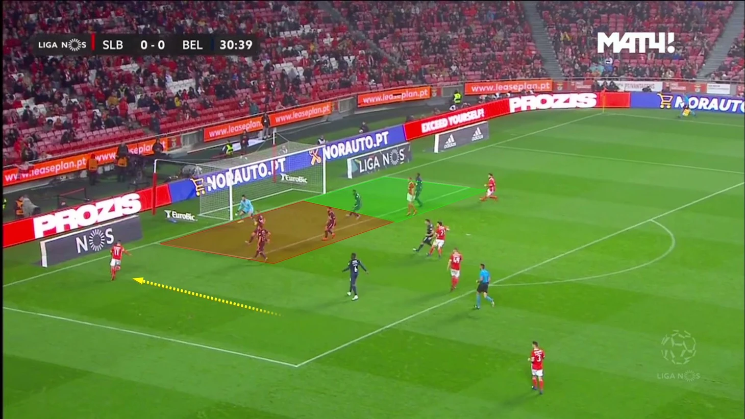 Вот еще классный пример, как Таарабт чувствует пространство и как грамотно туда открывается. На месте Габриэля будет Вайгль, просто тогда он еще не был игроком «Бенфики». Обратите внимание на то, что слева располагается Тавареш, то есть не стоит удивляться сменой флангами не только вингерами, а и крайних защитников.
