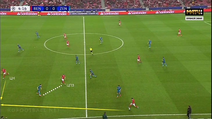 В общем, «Бенфика» старается выходить через короткий пас, выискивая свободные зоны. Когда соперник встречает низко, защитники тащат мяч в свободное пространство, когда высоко - пытаются играть коротко, но если вариантов для развития мало следует длинная передача на ЦН.