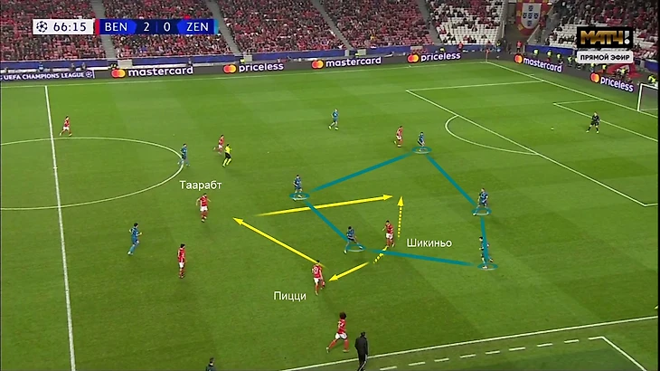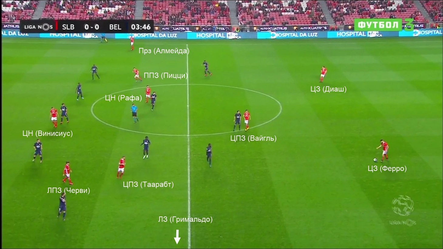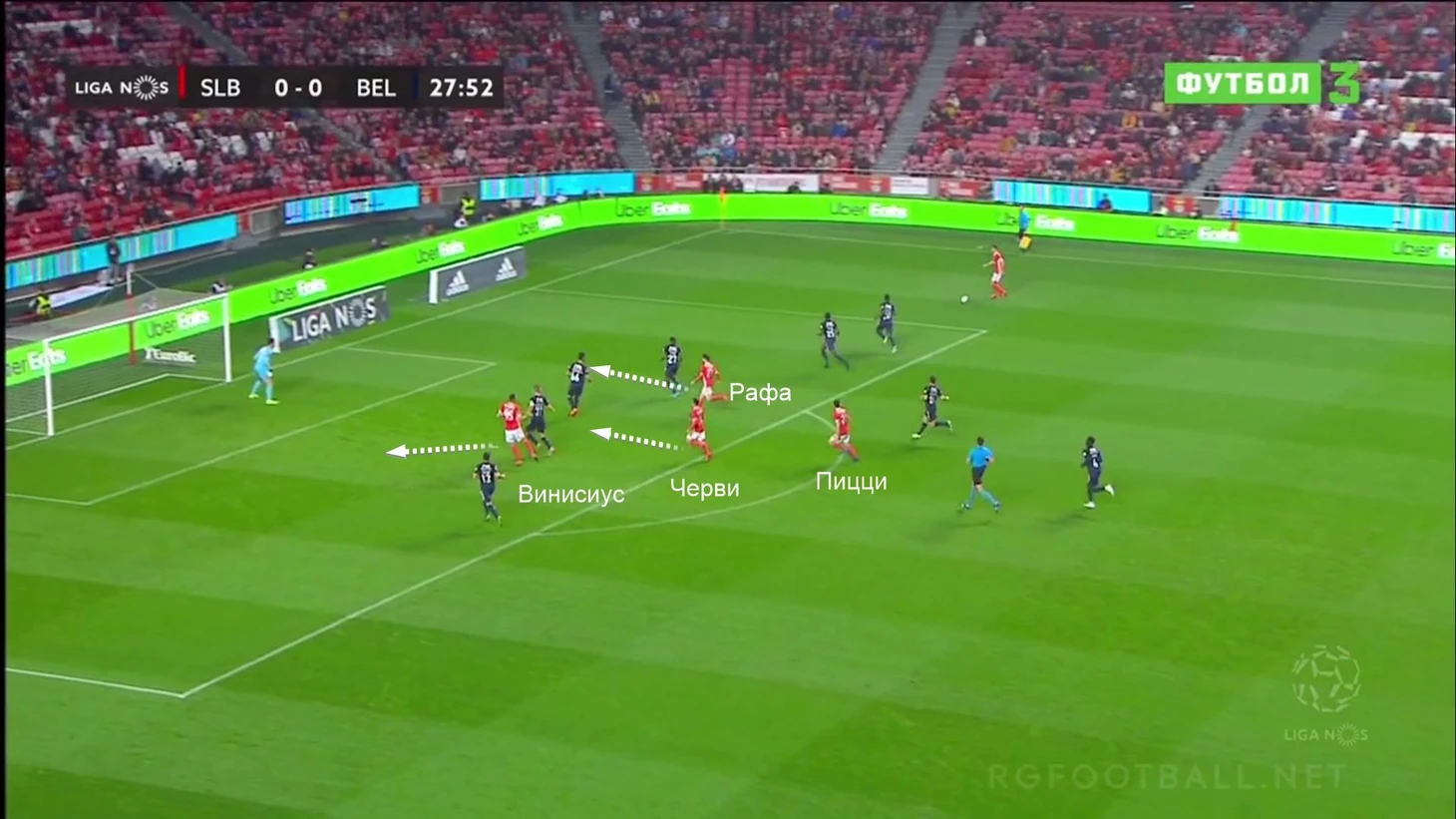 В полузащите можно быть более-менее уверенным за игроков центра. Вайгль и Таарабт имеют наилучшие шансы попасть в стартовый состав, о их плюсах и минусах также поговорим немного позже. На правом фланге, по идее, должен сыграть Пицци (игрок, который очень много решает), а на левом - Черви. Не стоит удивляться, если перед матчем будет нарисовано наоборот. Также на левом фланге могут сыграть и Рафа Силва, и Шикиньо. Но они существенно менее работоспособны и хуже играют при обороне (не доигрывают по сопернику до конца, занимают неправильную позицию). Например, против «Порту» Шикиньо играл левого хава и серьезно ошибся при голевой атаке соперника:
