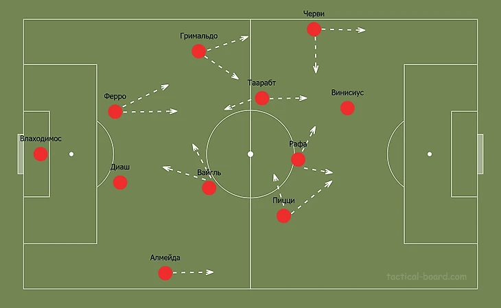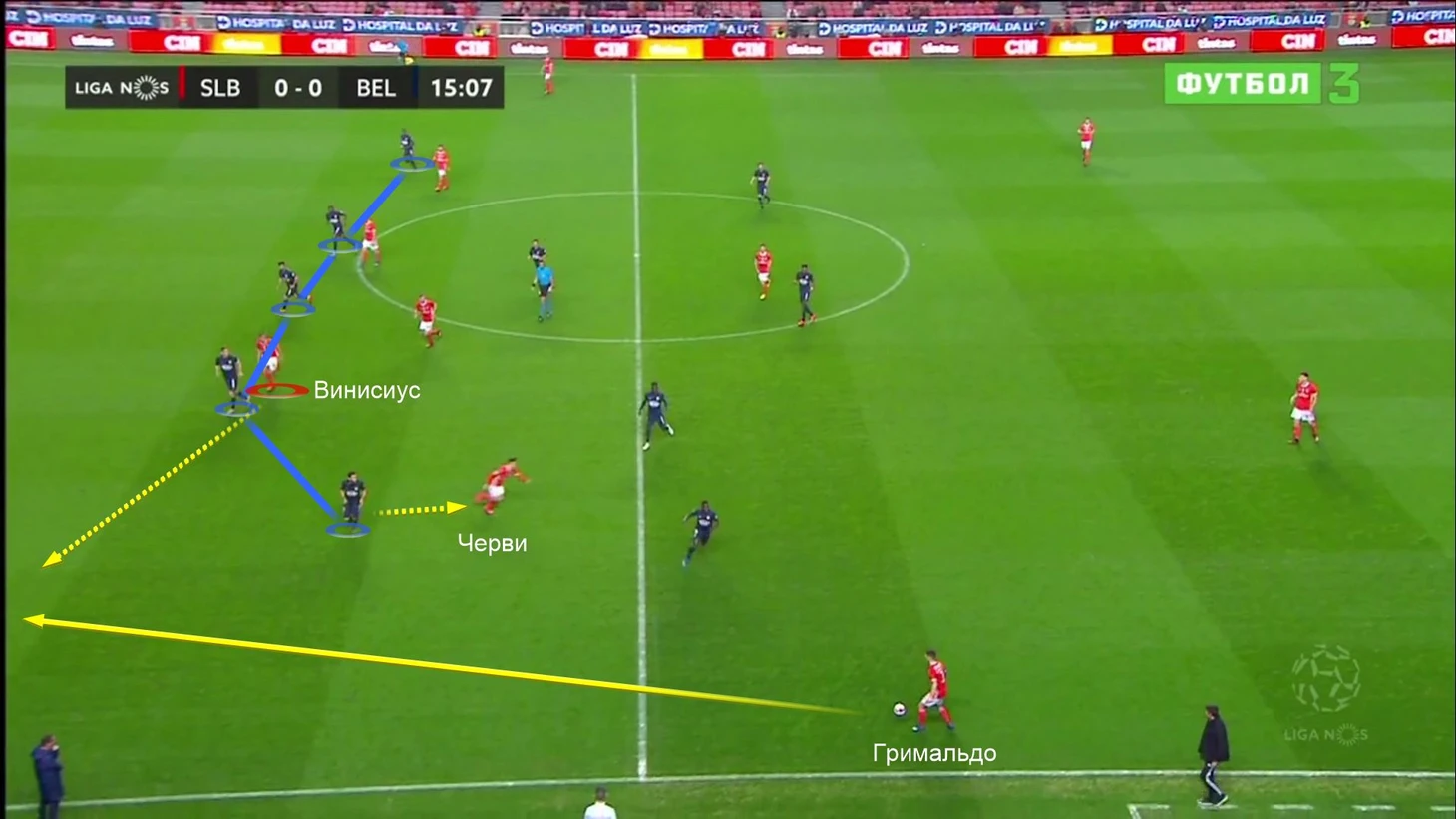 2. Мяч доставляется на левый фланг. Принимает мяч в большинстве таких эпизодов Гримальдо. И после приема следует длинная передача (низом) на Винисиуса - так отрезается очень много соперников, но есть еще несколько деталей. Важную роль при этом исполняет игрок в левом полуфланге. Он отходит чуть ниже атакующей линии, отвлекая правого защитника соперника. Обычно таким образом действует Черви и реже Таарабт.