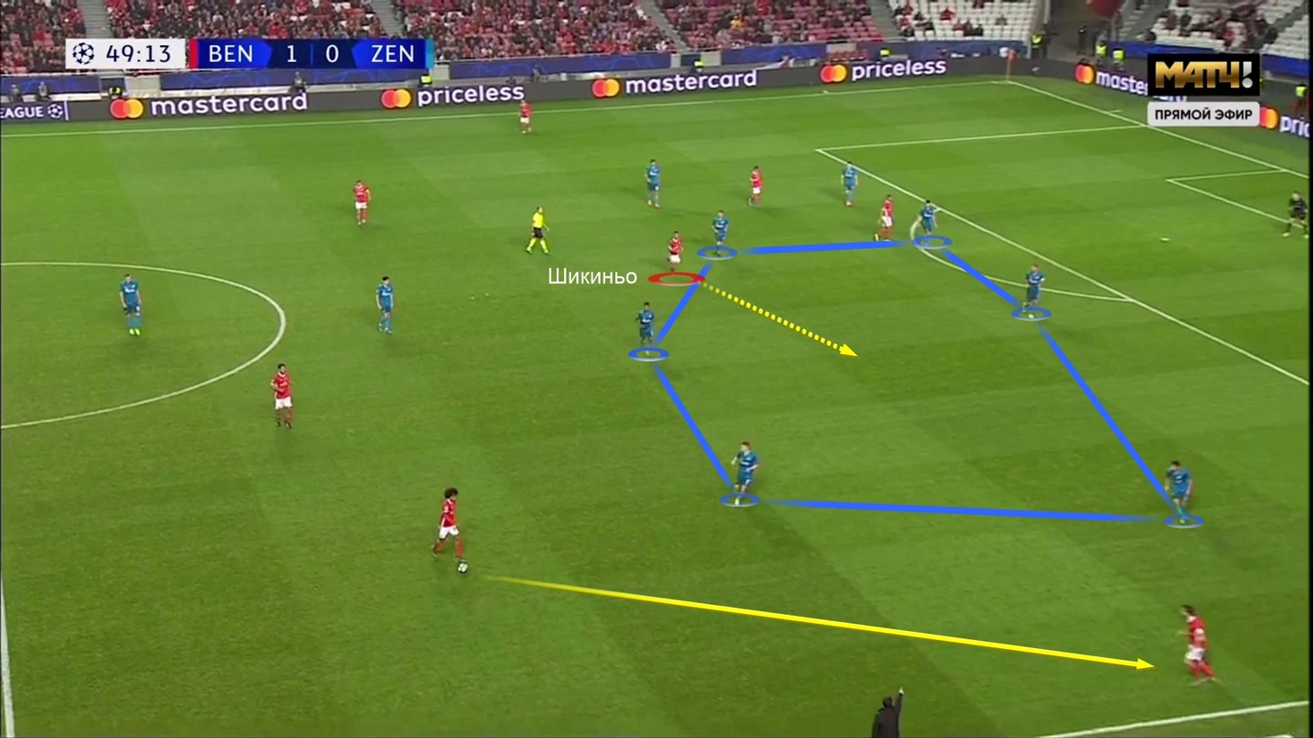 В этом эпизоде Шикиньо увидел, что правый защитник (Тавареш) занимает место в полуфланге, а вингер дает ширину. Он без проблем опустился на формальную позицию правого защитника, протащил мяч, сохранил его для команды, которая выиграла в пространстве и спокойно продолжила позиционную атаку. Но самое главное то, что Шикиньо не останавливается после паса на партнера, а продолжает движение. Он быстро заполняет до этого никем не атакуемое пространство за опорниками соперника. Вот еще пример, когда он видит возможность для потенциальной передачи на него и приема мяча в опасной зоне: