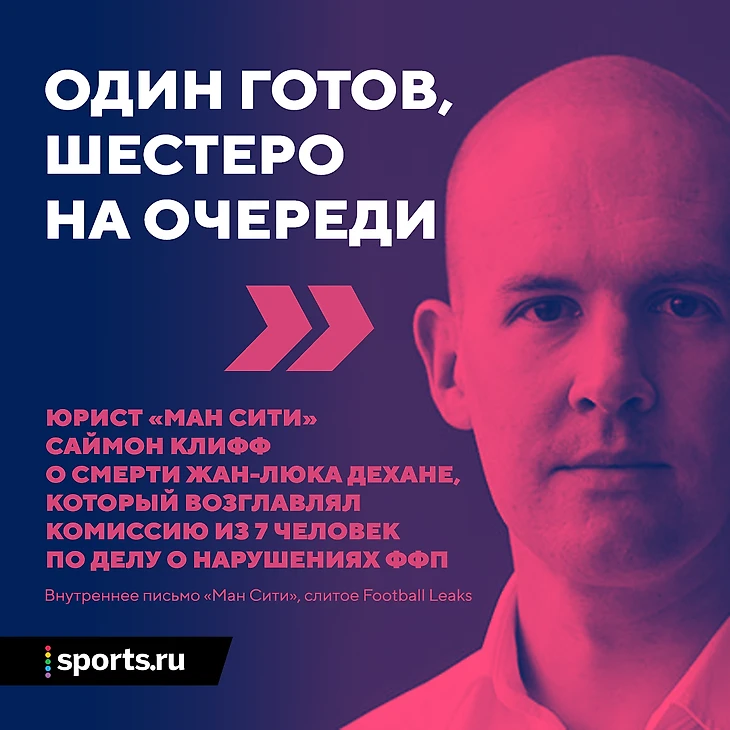 Еще раз, текстом: «Один готов, шестеро на очереди». Это пишет штатный юрист «Ман Сити» о смерти Жан-Люка Дехане, главы комиссии следственной палаты УЕФА по финансовому контролю за клубами.