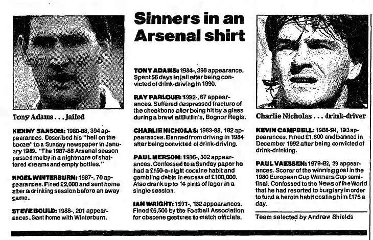 В конце 80-ых — начале 90-ых игроки Арсенала стабильно попадали на страницы газет, но довольно часто совсем не по футбольным причинам.