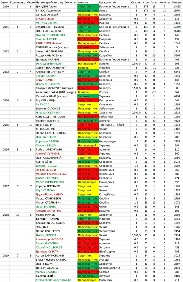 Примечание. Первый столбец – сезон, когда пришел легионер. Второй столбец – количество приглашенных легионеров в этот сезон. Третий столбец – место, занятое командой по итогу сезона. Четвертый столбец – имя и фамилия легионера, здесь красным цветом обозначены отзаявленные футболисты, зеленым – дозаявленные. Пятый столбец – амплуа легионера, здесь зеленым цветом обозначены успешные трансферы, желтым – средние трансферы, красным – провалившиеся и непонятные трансферы. По остальным столбцам все должно быть понятно. Добавлю, что оценка эффективности трансфера производилась на основании личных впечатлений и статистики.